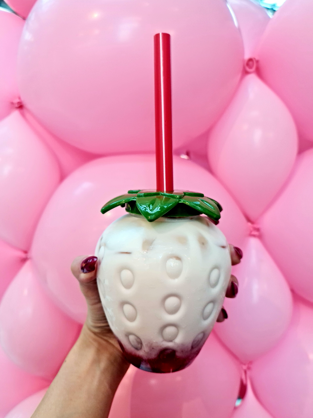 Drinks are poured into the most adorable and photogenic strawberry-shaped cups that are made convenient to drink from with a hole for the straw right at the top of the leafy green bottle cap.